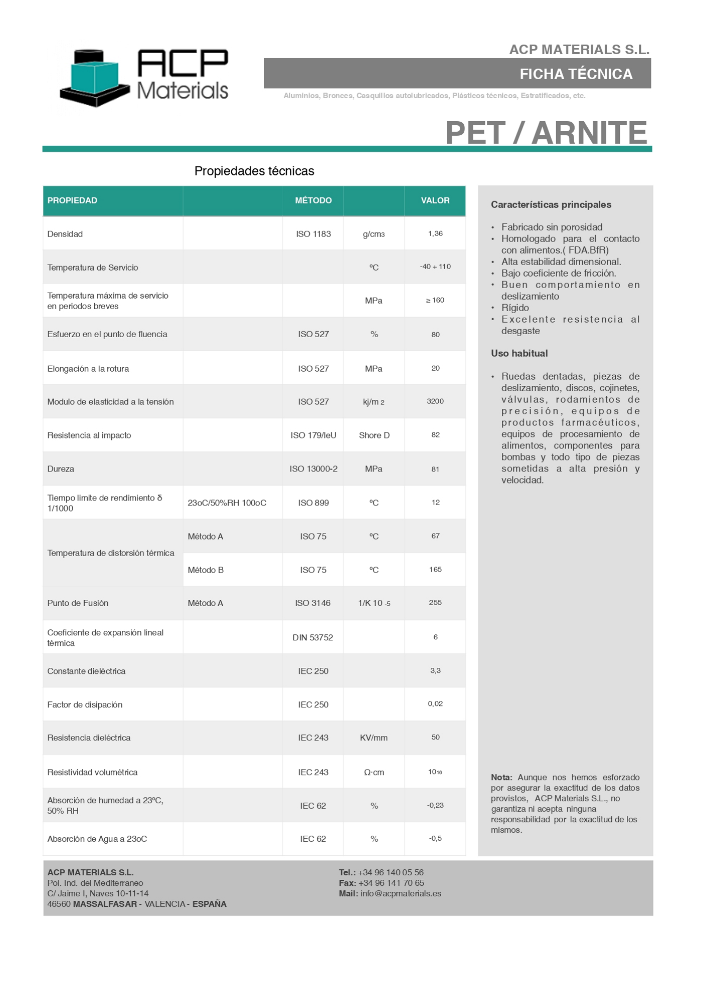 Es un termoplastico cristalino. Baja inflamabilidad y autoextingible, con reducida densidad de humo. Muy buena estabilidad dimensional. Excelente comportamiento deslizante, resistencia a la fricción y al desgaste. Optima relación entre rigidez, solidez y tenacidad. Muy elevada resistencia a la radiación de alta frecuencia. Buenas propiedades de mecanizado con arranque de viruta. Buenas propiedades adhesivas y de soldadura. Elevada resistencia a la deformación térmica por lo que permite un uso continuado con temperatura extremadamente elevada. Buenas propiedades eléctricas aislantes en un amplio abanico de temperaturas.