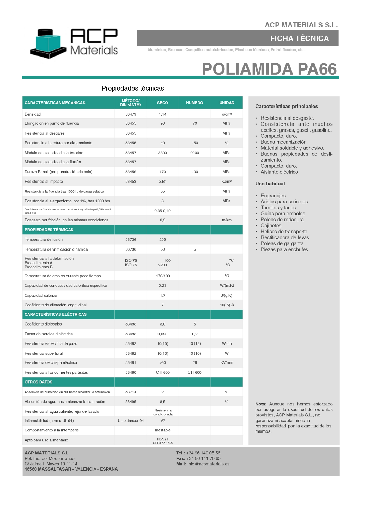 La PA 66 es un material termoplástico y semicristalino que posee una mayor rigidez y estabilidad dimensional que la PA-6, al igual que un punto de fusión más alto. Como consecuencia de su menor absorción de humedad nos garantiza tolerancias más ajustadas. Como la PA 6, presenta una elevada resistencia a la tracción y al desgaste. Es un material adherible, soldable y es un buen aislante eléctrico.