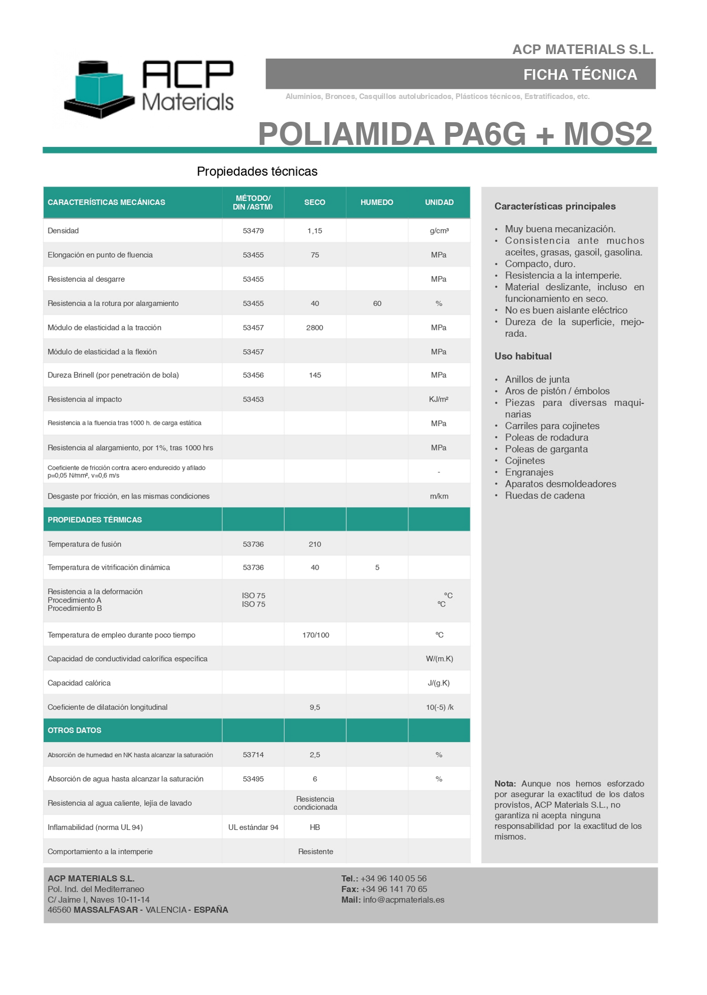La Poliamida 6G es una poliamida fundida semicristalina, muy apropiada para la mecanización con una elevada resistencia al impacto. Con bisulfuro de molibdeno (PA 6G + MoS2) sus propiedades cristalinas se ven aumentadas y presenta una buena resistencia a la intemperie.