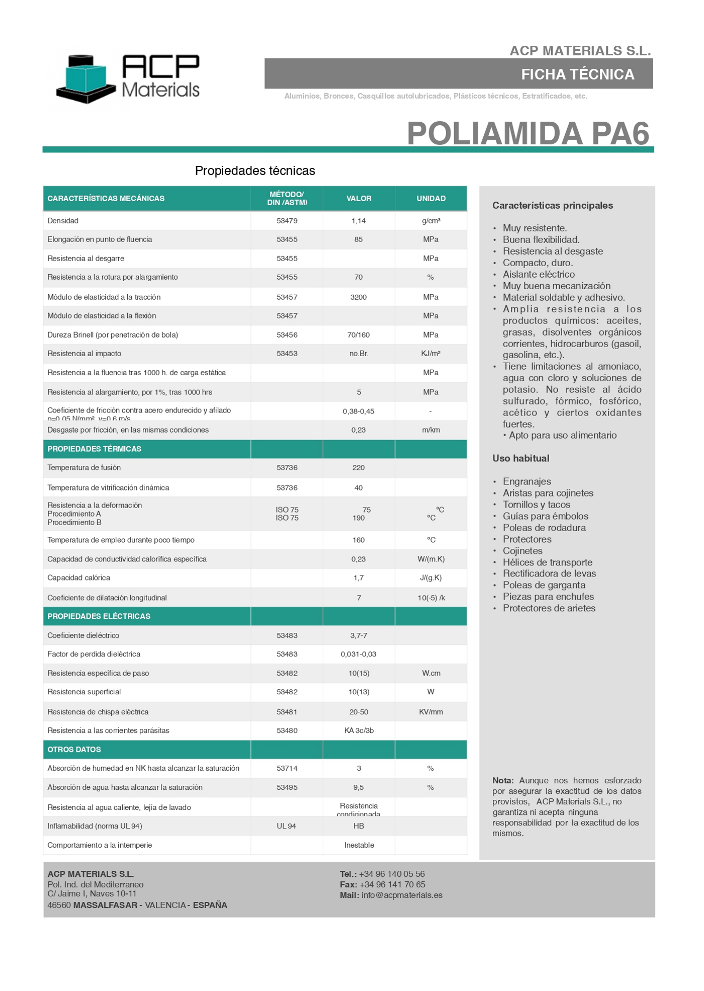 Es un termoplástico con estructura semicristalina con alta resistencia a la abrasión y al impacto. La Poliamida posee muy buenas propiedades mecanicas. Debido a su bajo peso específico se utiliza habitualmente como material de sustitucion de bronce, aluminio y otros metales no ferrosos.