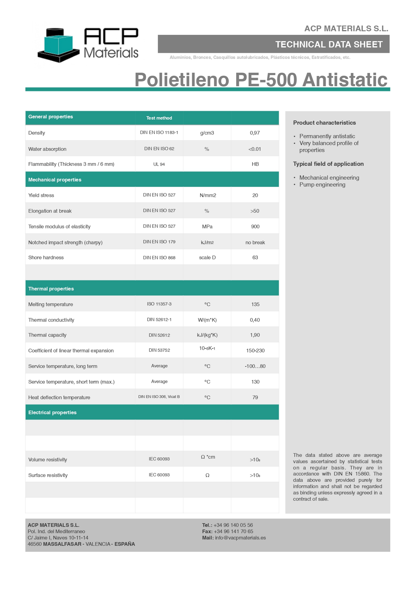 Es un Polietileno con materiales anti-estáticos permanentes y con un conjunto de propiedades muy bien equilibradas. La carga electroestática de la superfície se reduce, el polvo no es atraído y no habrá descargas electroestáticas.