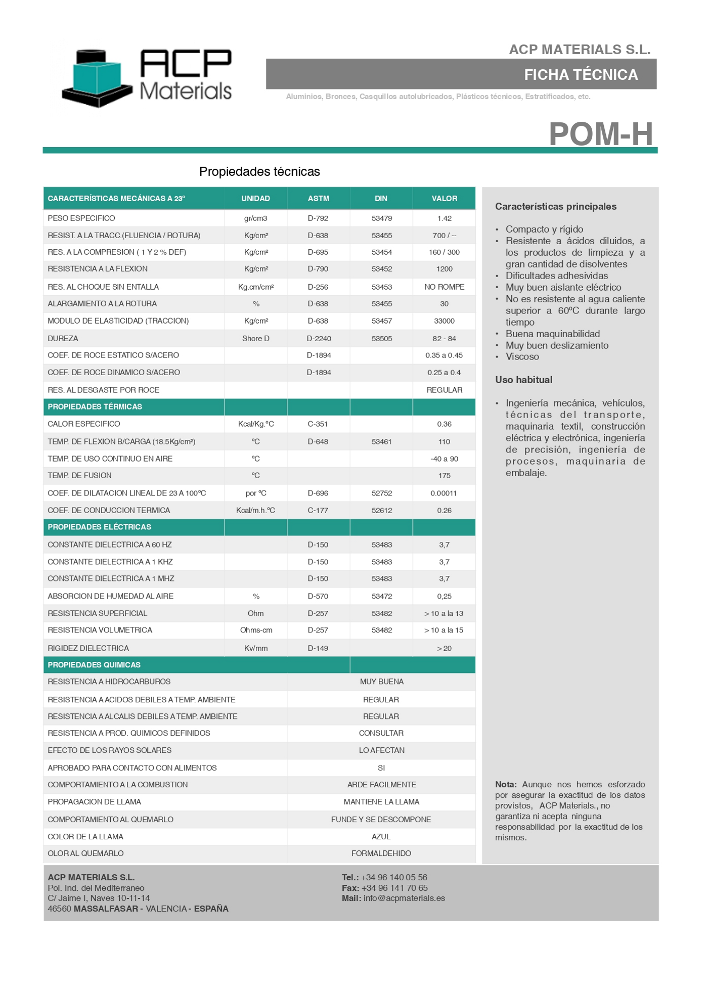Tanto el POM-C (Copolímero) y POM-H (Homopolímero) son similares en el conjunto de sus propiedades, aunque la principal diferencia entre ambos consiste en que las características mecánicas del POM-H son mejores que las de POM-C y su mecanización es más fácil. Sin embargo, la mejor resistencia del POM-H se ve neutralizado cada 10º C, con reducción de su resistencia y rendimiento en presencia de temperaturas altas, agua tibia y alcalinos.