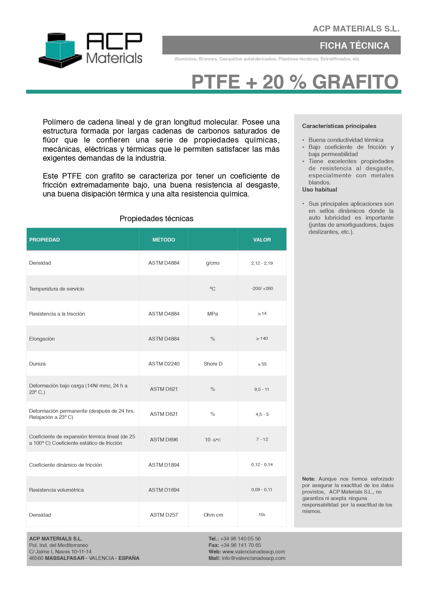 Este PTFE con grafito se caracteriza por tener un coeficiente de fricción extremadamente bajo, una buena resistencia al desgaste, una buena disipación térmica y una alta resistencia química.