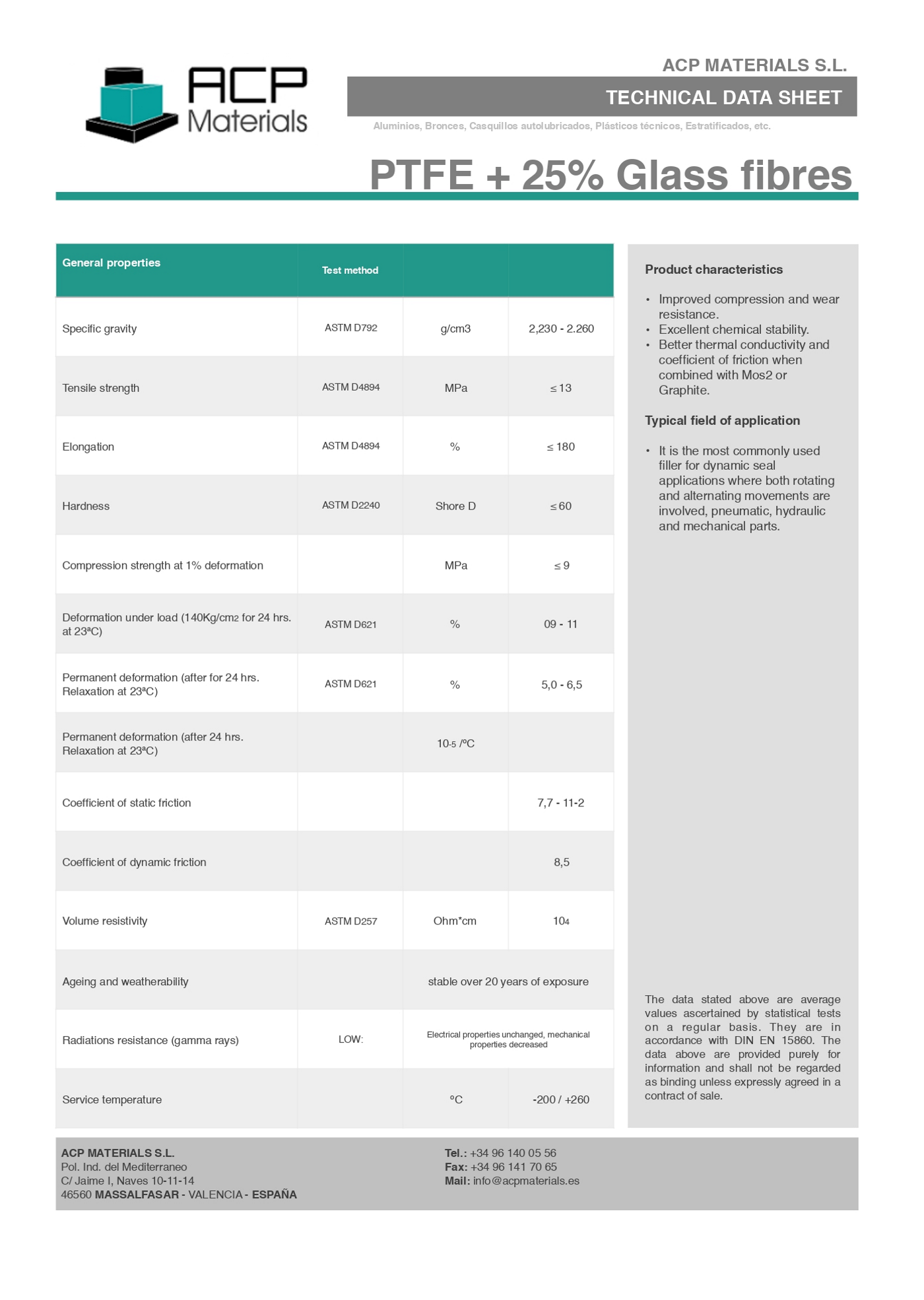En este caso nos encontramos con un PTFE cargado con fibra de vidrio. Tiene una alta resistencia química, exceptuando a los álcalis y al ácido fluorhídrico; Y con una elevada resistencia al desgaste y a la fricción.